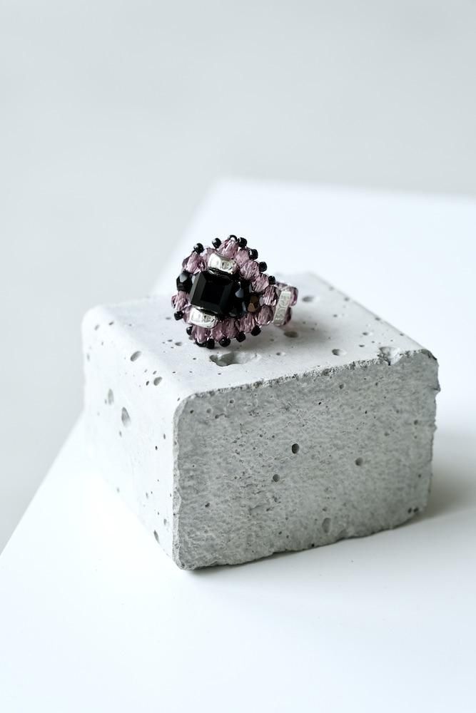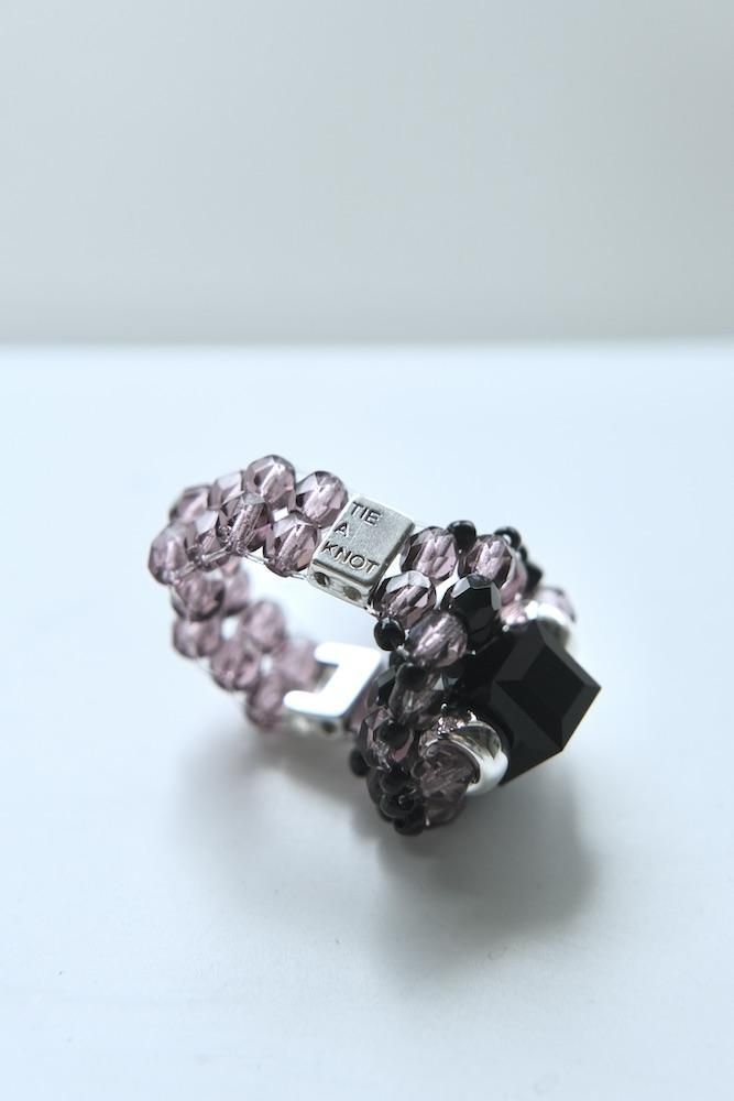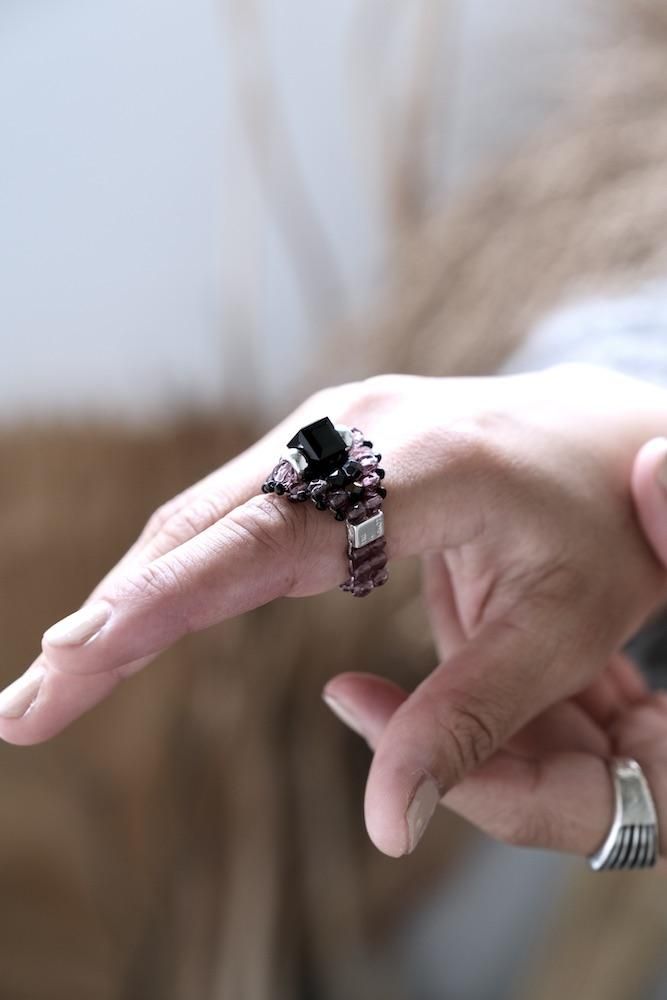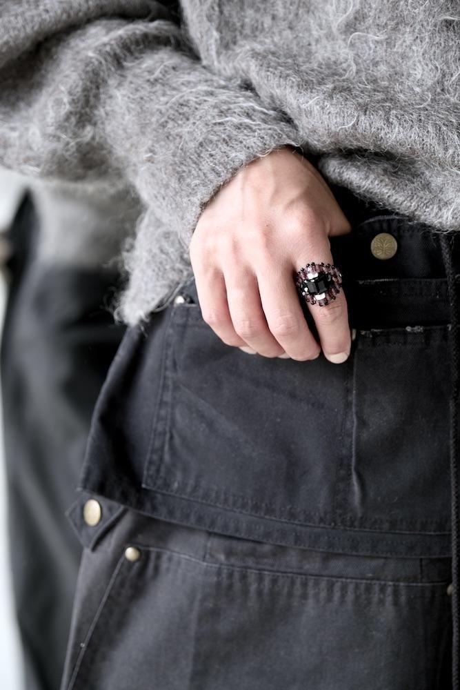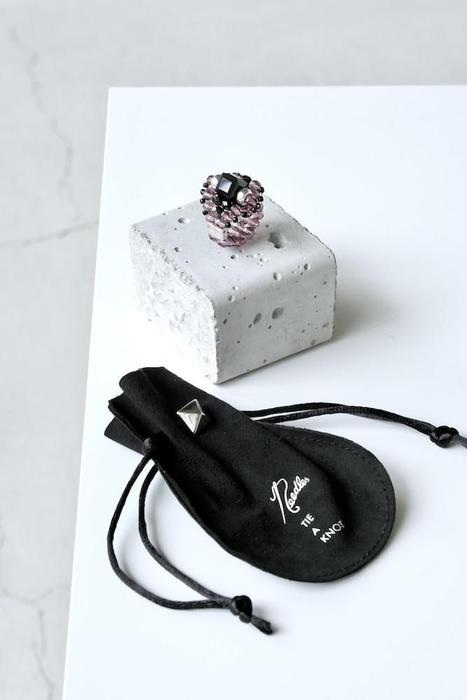 2024年にスタートした新ブランド『TIE A KNOT』と『NEEDLES』のコラボレーションアイテムです。美しい透明感と輝きを放つクリスタルガラスビーズを精密にカッティングしたリングには『NEEDLES』のアイコンであるパピヨンの刻印が施されたシルバーパーツがアクセントとなっており、職人が一点ずつ手作業で製作しました。ボリューム感のあるシルエットで手元を華やかに演出し、女性にも男性にもお薦めのリングです。