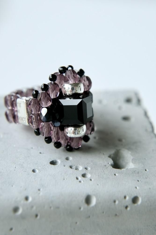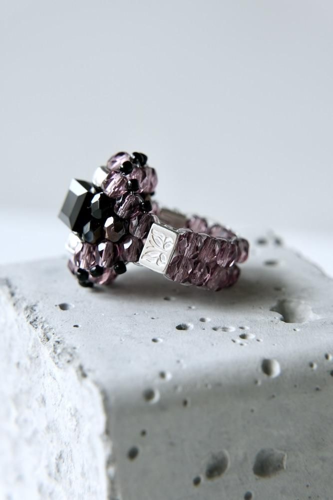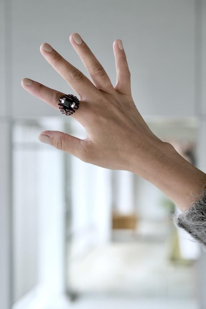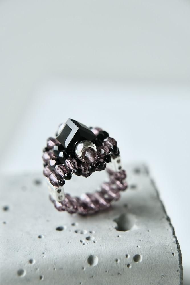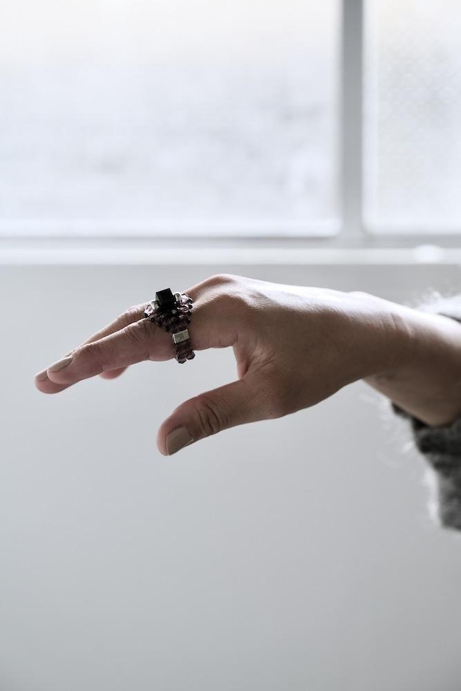 2024年にスタートした新ブランド『TIE A KNOT』と『NEEDLES』のコラボレーションアイテムです。美しい透明感と輝きを放つクリスタルガラスビーズを精密にカッティングしたリングには『NEEDLES』のアイコンであるパピヨンの刻印が施されたシルバーパーツがアクセントとなっており、職人が一点ずつ手作業で製作しました。ボリューム感のあるシルエットで手元を華やかに演出し、女性にも男性にもお薦めのリングです。