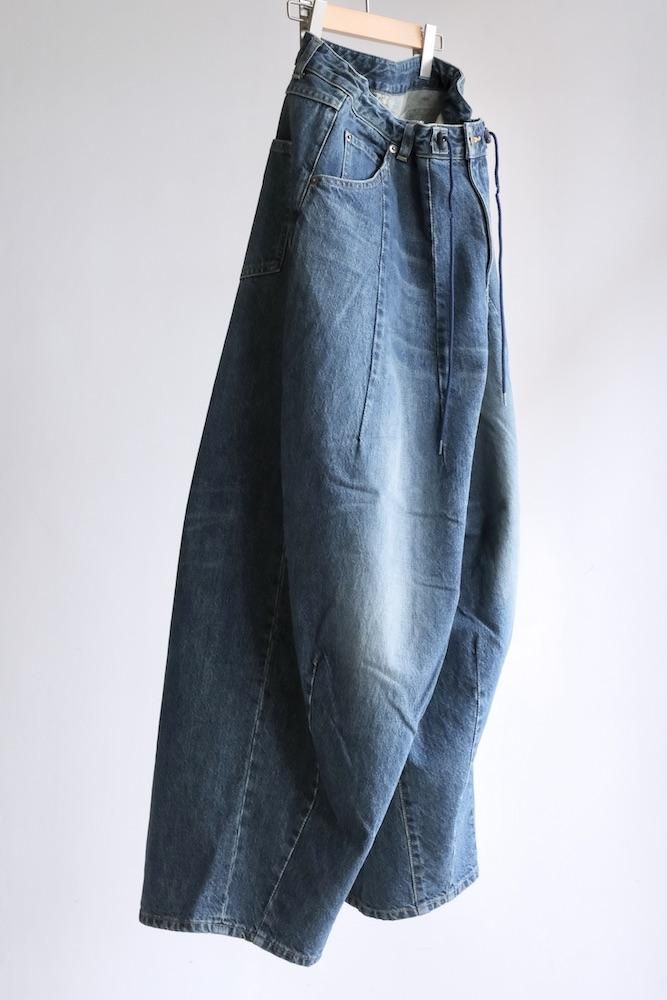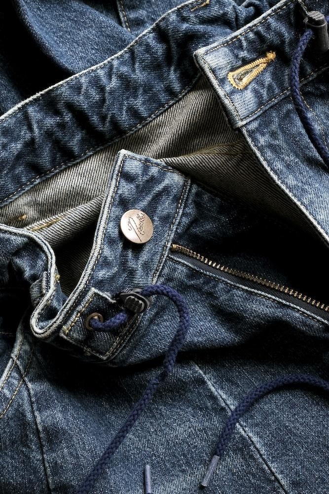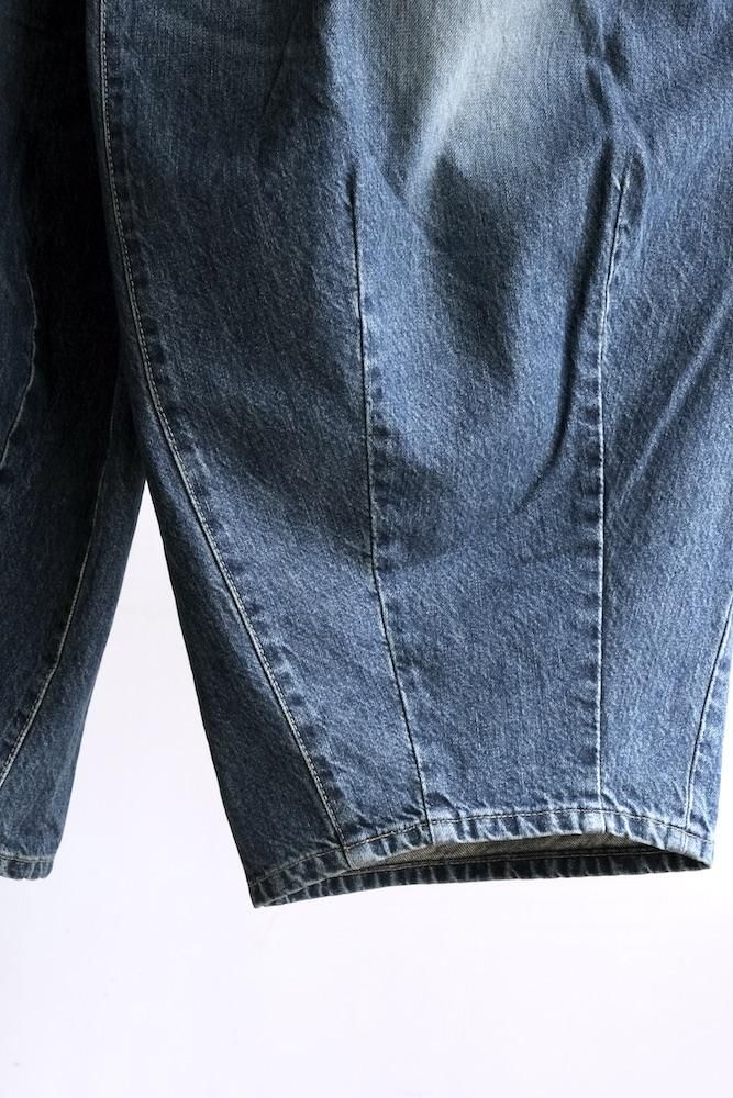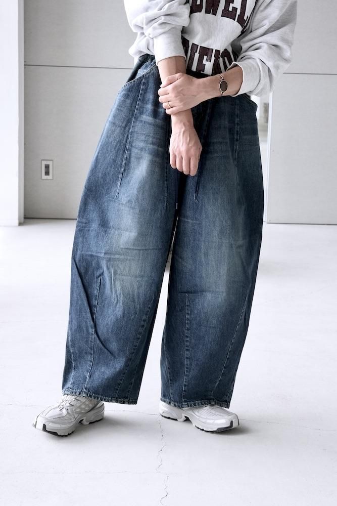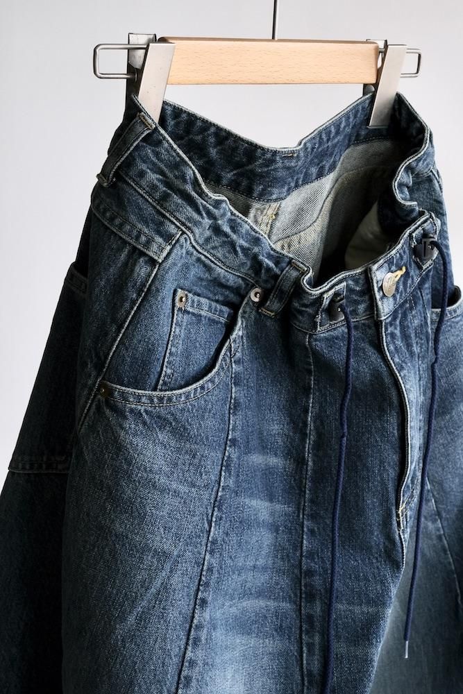 “膝出る=HIZADERU”の略称H.D.パンツ。ウエストと裾のダーツ処理によってフロントが大きく膨らんだ、独特のシルエットが魅力の定番的なボトムスです。5ポケットのデニムパンツをベースにして、12オンスデニムにヴィンテージ加工を施し生地を柔らかくしてリアルな色落ちを実現させました。バルーンシルエットのアバンギャルドなパンツですが、意外とバランスの取り易い不思議なパンツです。開放感のあるストレスのない履き心地で病付きになりますよ。