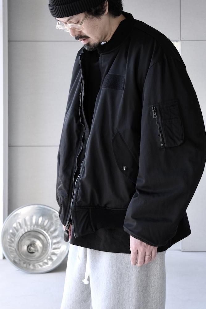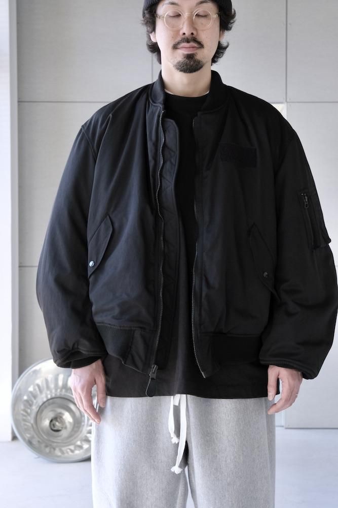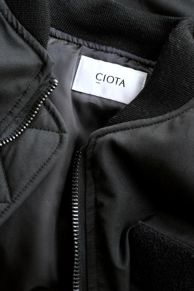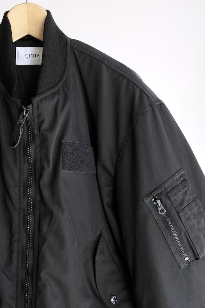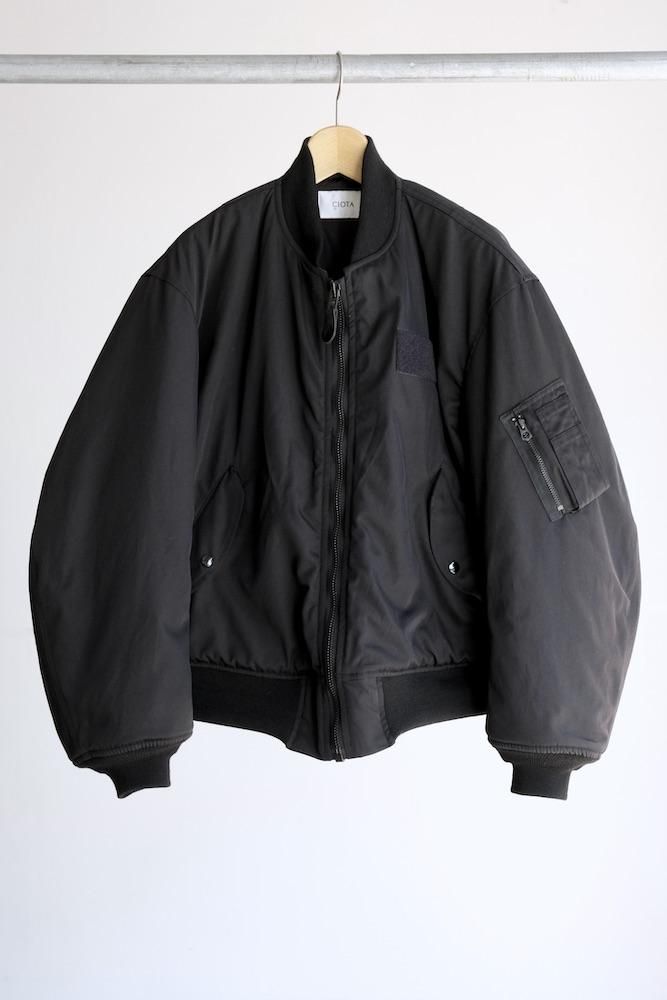MA-1 FLIGHT JACKET 1980年代にアメリカ軍がグランドクルーに支給していたタイプをベースにした『CIOTA』定番のMA-1を今シーズンは生地とシルエットを見直してリニューアルしました。生地はナイロンにスビンコットンを掛け合わせたツイル生地を使用しており、表面はマットですが滑らかで上質な肌触りが特徴です。中綿には熱伝導性が低いTORAYの超繊細繊維を採用しており、いったん取り込んだ熱を逃がし難く、ダウンの2倍の暖かさを誇ります。また、米国スコービル社製の無骨なファスナーにも拘りました。シルエットはオリジナルよりもワイドフィットにアレンジしており着丈も少し長めで現代的なバランスの良いシルエットに仕上がっております。